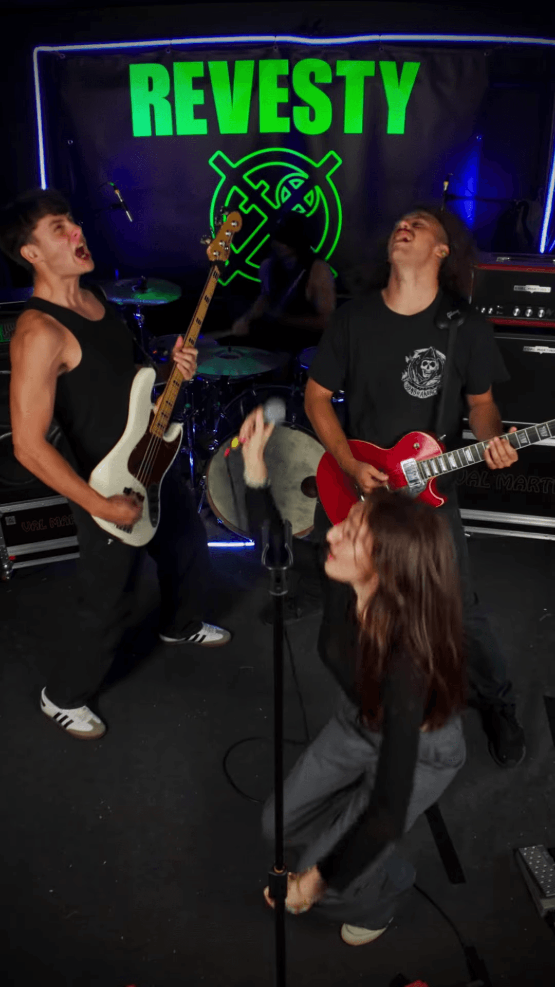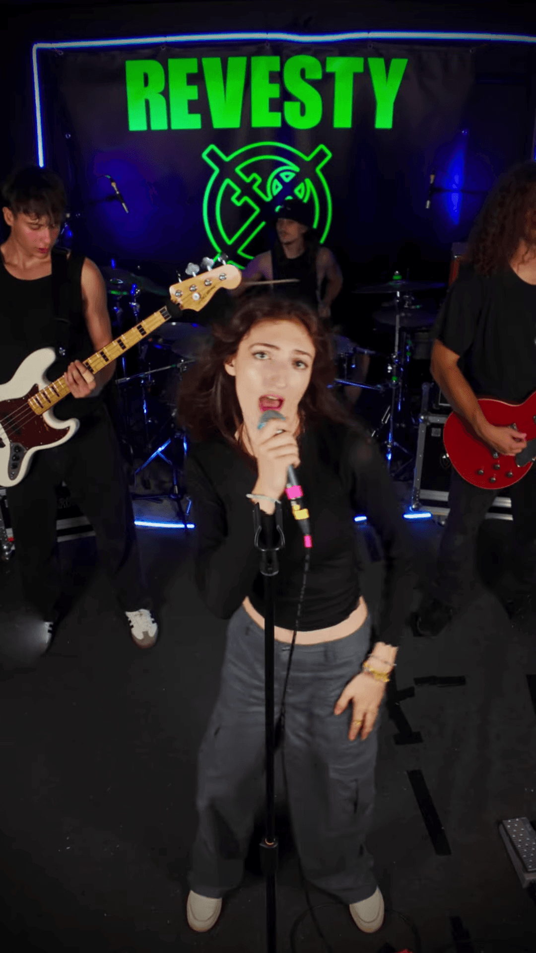 Ce clip a été l’occasion de travailler la direction artistique dans un cadre contraint, tout en gardant un visuel fort et cohérent avec l’univers du groupe. Le format vertical exige une recomposition complète des repères de tournage : gestion de l’espace, construction de la profondeur et placement des artistes. J’ai donc porté une attention particulière à la lumière, au décor et au timing des actions, afin de maintenir l’intérêt malgré la fixité du cadre. Cette approche m’a également amené à travailler en étroite collaboration avec le groupe pour synchroniser chaque détail avec l’énergie du morceau, tout en respectant les contraintes de captation en temps réel.